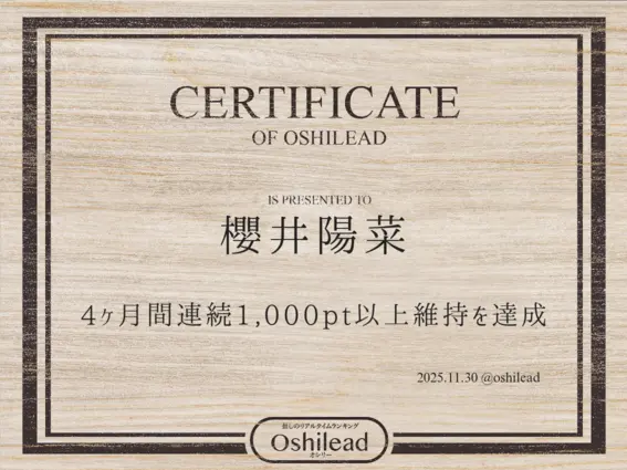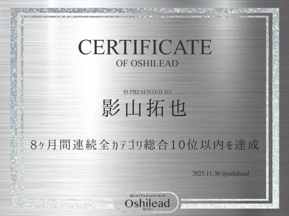 推しパワー急上昇椿泰我 (+1,657pt)17,847ptアイドル9位近藤孝行 (+829pt)11,823pt声優3位小野大輔 (+510pt)6,217pt声優6位髙橋海人 (+406pt)14,879ptアイドル11位天城サリー (+398pt)3,875ptその他1位陽月るるふ (+322pt)8,254ptVTuber1位永瀬廉 (+318pt)9,413ptアイドル15位神山智洋 (+195pt)5,404ptアイドル17位東拓海 (+185pt)1,535pt俳優8位皇美緒奈 (+176pt)5,499ptアーティスト4位鈴木大河 (+175pt)12,249ptアイドル13位古川慎 (+158pt)4,869pt声優8位妃那子 (+140pt)16,468ptアーティスト1位佐野晶哉 (+124pt)2,034ptアイドル28位凪乃ましろ (+106pt)4,042ptVTuber2位大野智 (+105pt)245ptアイドル62位白石麻衣 (+104pt)118ptアイドル67位宇髄天元 (+104pt)1,107ptキャラクター4位結那 (+98pt)718pt声優42位蒼木陣 (+97pt)936pt俳優20位